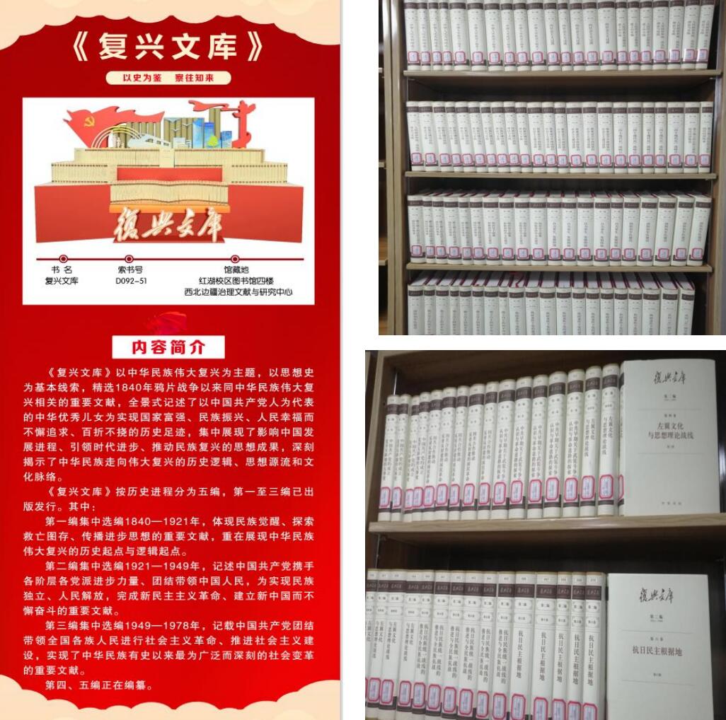 近日,AC米兰中文官网图书馆完成大型历史文献丛书《复兴文库》第一至三编的采购、编目和加工,已在红湖校区图书馆四楼西北边疆治理文献与研究中心专题书架展出,为全校师生使用这批具有重要历史价值和时代意义的珍贵文献提供便利。