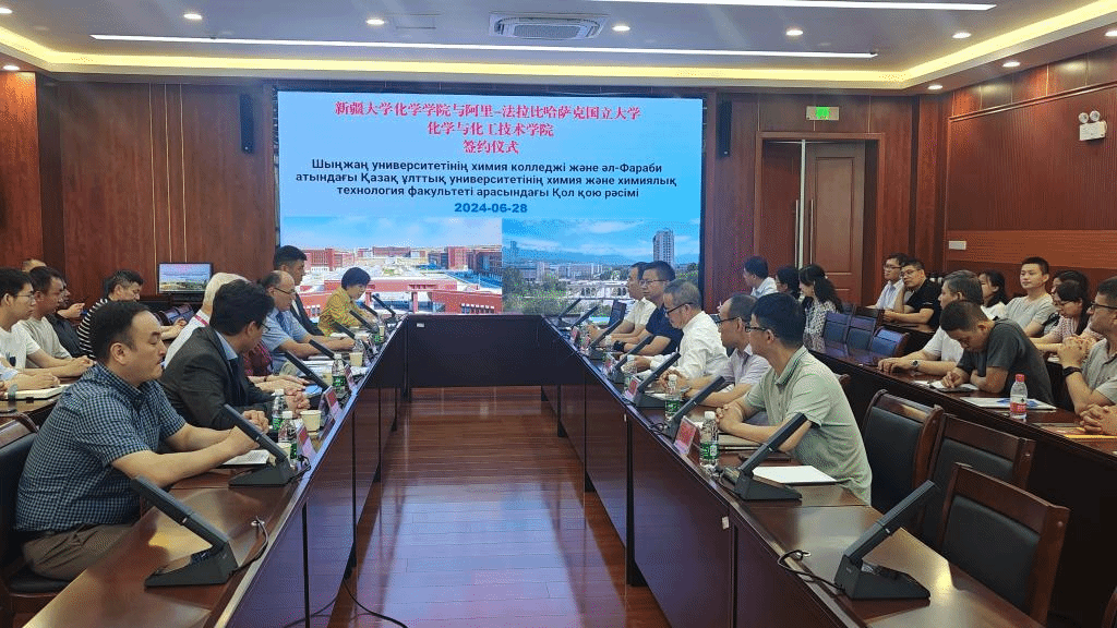 阿里-法拉比哈萨克斯坦国立大学曼苏罗夫·祖力喀哈尔(Mansurov Zulkhair)院士、昂达尔巴耶夫·叶儿多斯(Ongarbayev Yerdos)教授、图列波夫·马拉特(Tulepov Marat)教授、贝森诺夫·热纳特(Beissenov Renat)教授、吐尔逊别克·萨比特(Tursynbek Sabit)和克里木库诺夫·阿尔玛古丽(Kerimkulova Almagul)教授,AC米兰中文官网化学学院院长华瑞茂、党委副书记郭继玺、副院长希尔艾力·买买提依明和王多志参加活动仪式。来自阿里-法拉比哈萨克斯坦国立大学化学与化工技术学院、AC米兰中文官网化学学院60余名教师代表参加此次签约仪式。签约仪式由华瑞茂主持。