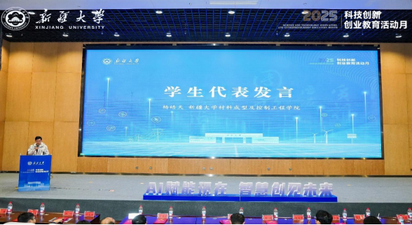 随后,学生代表杨皓天上台发言。他表示会继续扎根专业,夯实知识基础;敢于跨界融合,拓宽创新视野;更会带着敬畏之心,把论文写在祖国大地上,让科技创新真正服务于生活、造福于社会。杨皓天同学真挚而昂扬的发言,展现了新疆学子敢想敢创、积极向上的精神风貌。