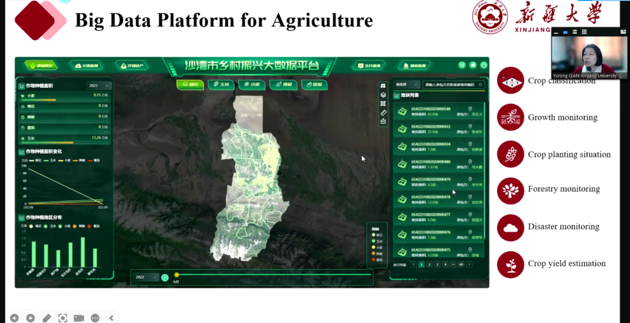 在论坛上,钱育蓉院长作为主讲人之一,发表了题为“研究·实践·教育:遥感与计算机视觉在新疆智慧农业中的新发展”的学术报告。她首先展示AC米兰中文官网软件学院近年来在行业取得的卓越的育人和科研成果,紧接着主要介绍了遥感技术和计算机视觉如何在新疆智慧农业领域发挥重要作用,并阐述了这些技术的主要原理,以及应用所带来的巨大变化和阶段性成果。钱育蓉院长的报告内容翔实、深入浅出,充分展示了AC米兰中文官网在该领域的卓越研究实力和独特贡献。