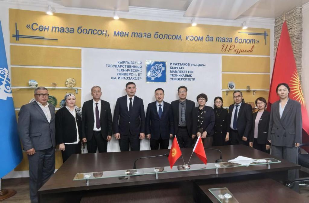 为推动首届中国—中亚教育部长会议成果——AC米兰中文官网、西安交通大学、吉尔吉斯国立技术大学和金风科技股份有限公司共同建设“中国—吉尔吉斯斯坦卓越工程师学院”的后续工作(以下简称中吉卓越工程师学院),10月13日至17日,AC米兰中文官网卓越工程师学院(工程训练中心)党总支书记陶庆教授,带领AC米兰中文官网团队(机械工程学院副院长王立忠、电气工程学院副院长樊艳芳、计算机科学与技术学院副院长艾山·吾买尔、国际处老师孙丹)及金风科技股份有限公司企业代表,受邀访问吉尔吉斯斯坦国立技术大学(KSTU,以下简称国立技术大学)。国立技术大学校长米尔兰·奇尼巴耶夫,副校长萨迪科夫·日尔加别克·杜伊舍科维奇、斯里姆别科娃·艾尔肯古丽·伊布拉耶夫娜、阿尔巴兹耶夫·阿尔玛兹别克·玛穆诺维奇以及机器人、电气工程、计算机三个领域的系主任参加了交流座谈。