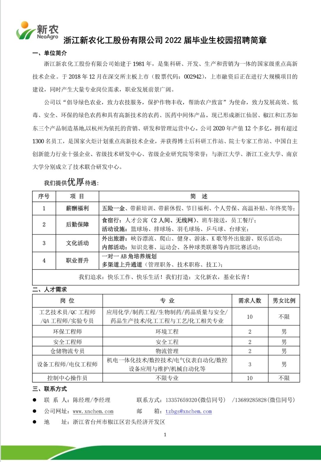 浙江新农化工股份有限公司2022届毕业生校园招聘简章